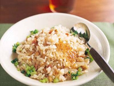 炊き上がったらサックリと混ぜ、器に盛り、大根の葉を散らす。