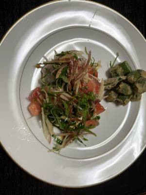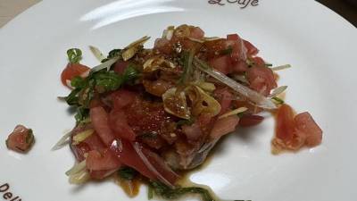 トマト以外の1の野菜をあえ、さらにトマトを加えてあえる。器に3の魚を盛り、薄切りにんにくとともに野菜をのせ、上から2のたれを適量かける。