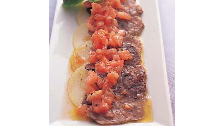 柔らかく煮た牛すね肉をオリーブ油と白ワインビネガーで前菜風にいただきます。牛肉のうまみをしっかり味わえますよ。
