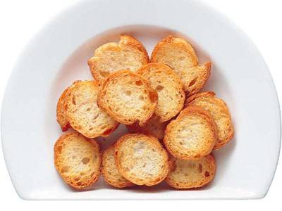 フランスパンは1cm厚さに切り、両面に軽くオリーブ油をぬる。オーブントースターか210℃に温めたオーブンで焼く。