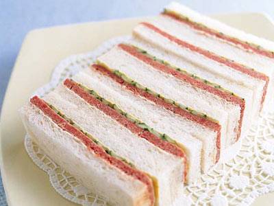 残りの食パン2枚の片面にマヨネーズをぬって3にかぶせ、ラップまたは水けを堅く絞ったふきんをかけ、バットなどで軽いおもしをする。約10分間おいてみみを切り落とし、長さを3等分にする。