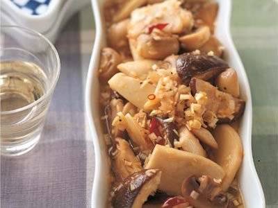 フライパンにオリーブ油大さじ4を熱し、にんにくと赤とうがらしを加えて炒め、香りがたったら1のきのこを加えて炒める。