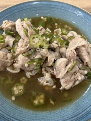 鍋に【A】を入れて中火にかけ、煮立ったら豚肉を加える。アクを除いてオクラを加え、ふたをして約2分間煮る。ふたを外し、しめじ、しょうがを加えてさらに約2分間煮る。