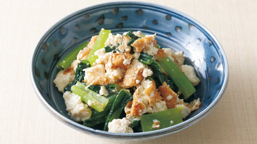 小松菜はシャキッ、厚揚げはフワッ。2つの食感が絶妙な組み合わせです。小松菜にしょうゆで下味をつけておくのがおいしさの秘けつ。