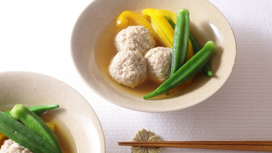 山椒(さんしょう)香るフワフワの肉だんごがうれしい、和のごちそう。だしのきいたやさしい味わいに、夏野菜でメリハリを加えました。