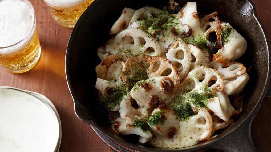 れんこんはこんがりと焼き色をつけ、食感よく仕上げる。