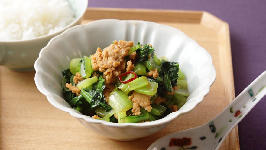 フライパンにひき肉を入れて中火で炒める。白っぽくなったら小松菜の茎を加え、1分間ほど炒める。【A】を順に加えて軽くなじませ、小松菜の葉を加えてサッと炒め合わせる。