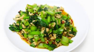 小松菜は堅めの葉野菜。葉と茎に分け、茎を先に加えてしっかりと炒める。