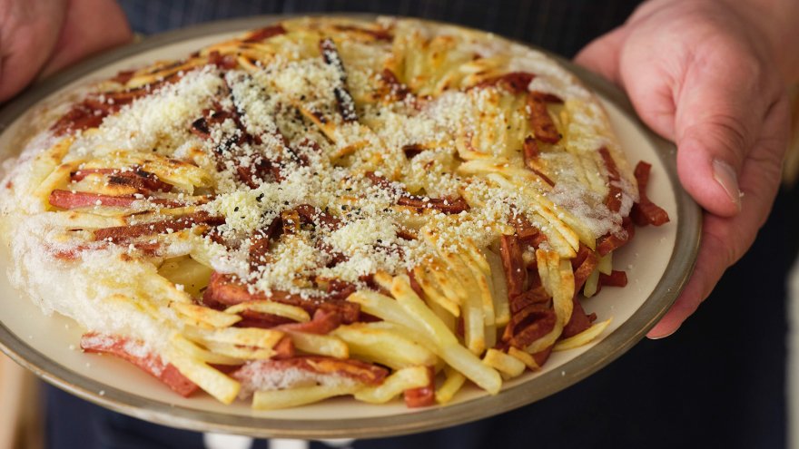 混ぜ合わせた【水溶きかたくり粉】を回しかけ、約3分間焼く。全体にこんがりと焼き色がついたら、フライパンより大きい皿をのせ、フライパンを返して皿に移す(やけどに注意)。オリーブ油を回しかけ、粉チーズと黒こしょうをふる。