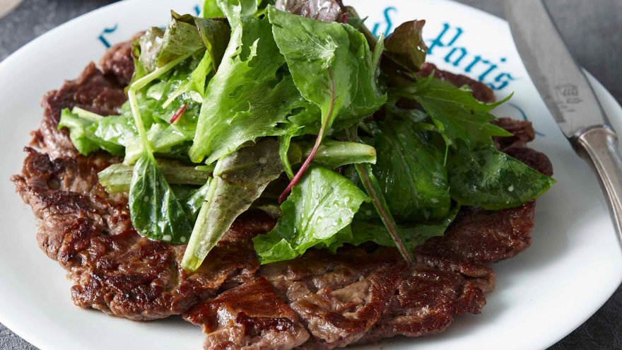 酸味のきいたドレッシングがシンプルなステーキの味にメリハリをつける。