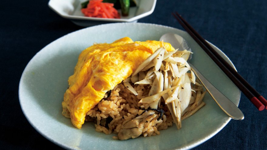 器に4のかきの炊き込みご飯を盛って5のごぼうを添え、ご飯を覆うように6の卵をのせる。