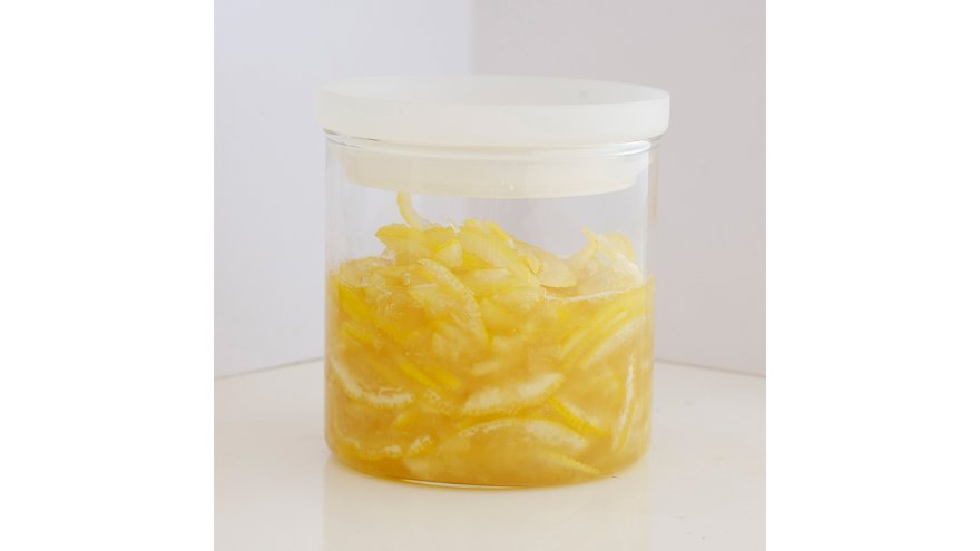 煮沸消毒した広口の保存瓶(容量600~800ml)に果汁を搾り入れる。皮は薄皮をつけたまま横に薄切りにして加える。