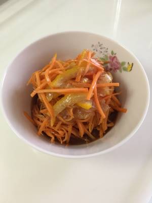 にんじんはスライサーで5~6cm長さのせん切りにする。ボウルに入れて塩をふって軽くもみ、しんなりするまで20分間ほどおく。