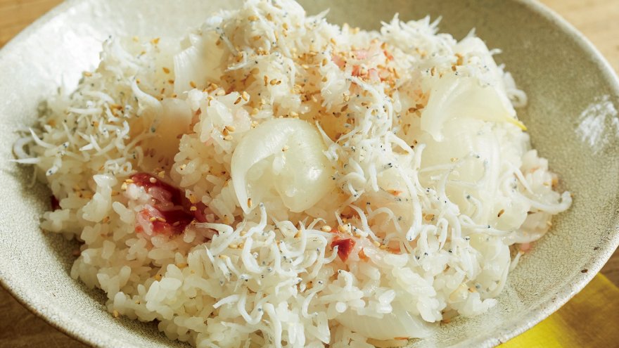 丸ごと炊き込んだ新たまねぎの甘みを、梅干しの酸味、しらすのうまみが追いかけます。