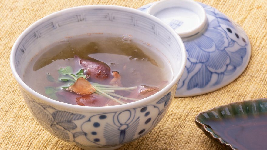 1のほたるいかと、とろろ昆布を器に入れ、熱湯150mlを注ぐ。うす口しょうゆで味を調え、貝割れ菜をあしらう。