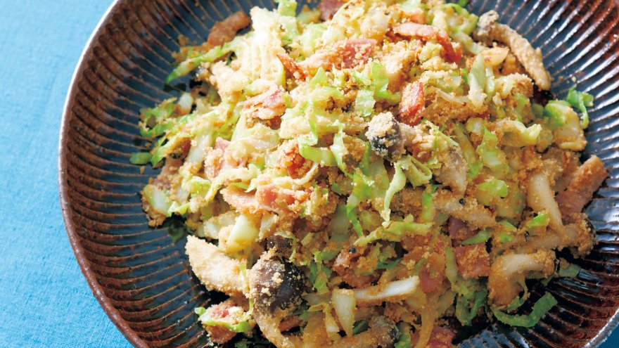 小さめのフライパンにサラダ油大さじ1を中火で熱し、ベーコンとしめじを入れて2〜3分間炒める。キャベツを加えてさらに炒め、しんなりしたら【A】を順に加えて全体にからめる。