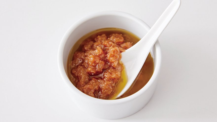 梅干しは種を除いて包丁でたたき、ボウルに入れる。