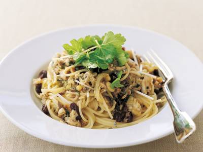ほぐしながらいためた、あじのまろやかなうまみに、レーズンの自然の甘みと松の実の食感がアクセントに。