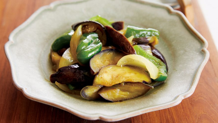 1のなすは水けを拭き取る。フライパンに【A】を入れて中火にかけ、軽く混ぜる。香りが出たら、なす、たまねぎ、ピーマンを加えてサッと炒める。