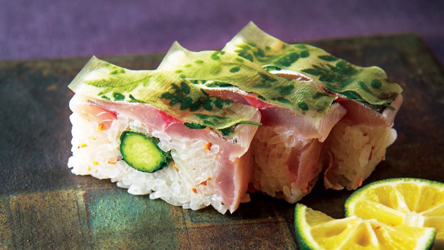 【白板昆布の甘酢煮】は押しずしの大きさに切ってのせる。