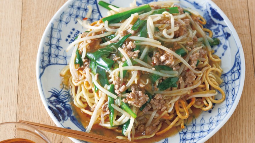 フライパンにごま油大さじ1を中火で熱し、しょうがを入れて炒める。香りがたったら、ひき肉を加え、ほぐしながら炒める。肉の色が変わったら、【A】を順に加えて炒め、もやしとにらを加え、サッと炒め合わせる。スープを加え、煮立ったら、【水溶きかたくり粉】をもう一度混ぜて回し入れ、全体を混ぜてとろみをつける。火を止め、3の麺にかける。