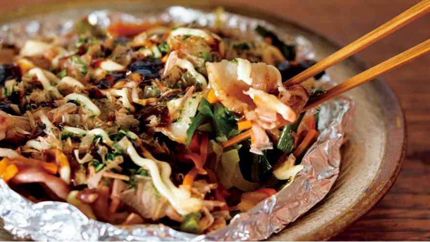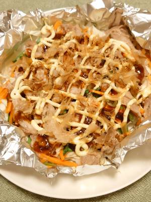 同じ大きさのアルミ箔をもう1枚かぶせて包む。天板にのせ、オーブントースターに入れて20分間焼く(トーストを焼く温度)。ソース、青のり粉、削り節、マヨネーズをかける。