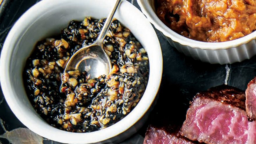 はちみつ、黒ごま・ごま油、白ワインビネガーを1に加え、混ぜる。