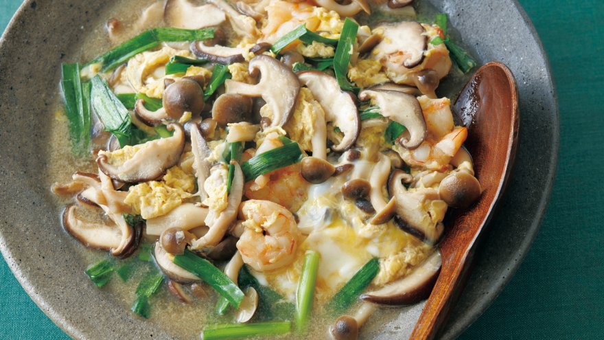 しいたけは根元の堅い部分を切り落とし、縦に薄切りにする。しめじは根元を切り落とし、小房に分ける。にらは3cm長さに切る。えびは背ワタがあれば竹串を刺して除き、サッと洗って水けを拭く。卵は溶きほぐしておく。