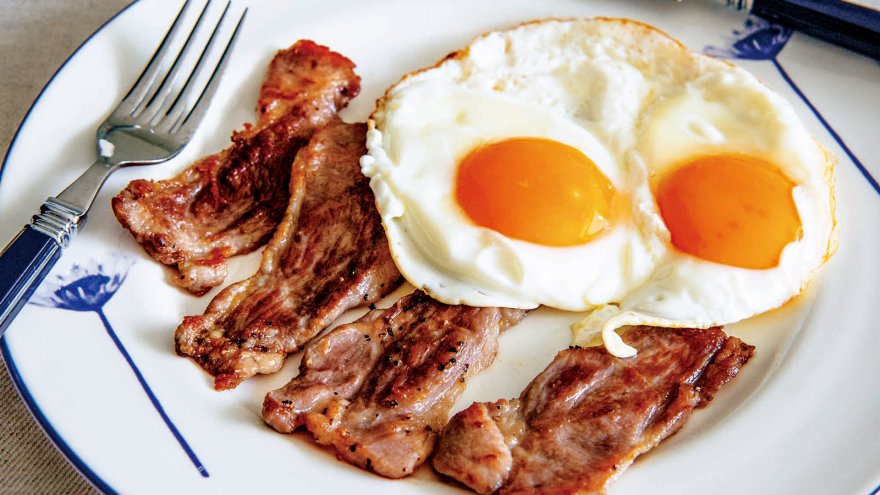 フライパンにサラダ油を中火で熱し、4のこしょう豚を並べ、両面をこんがりと焼いて中まで火を通して取り出す。同じフライパンで目玉焼きをつくり、こしょう豚とともに器に盛り、トマトケチャップを添える。