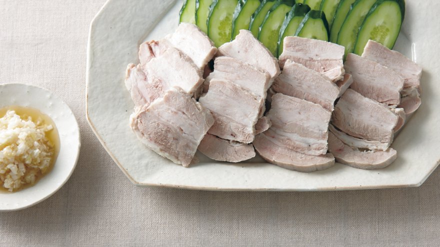 ゆでることでバラ肉の脂が程よく抜けてさっぱり。薄く切って、風味のよいねぎ塩だれで味わいます。