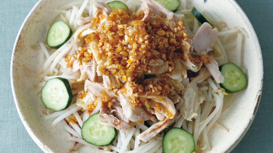 鍋に湯を沸かしてもやしを入れ、中火で約2分間ゆでる。ざるに上げて冷ます。きゅうりは2〜3mm厚さの輪切りにする。ゆで鶏は骨を外し、食べやすい大きさに裂く。皮は手で小さくちぎる。