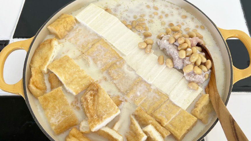 再び煮立ったら豆乳を加え、鶏肉に火が通るまで煮たら取り分けていただく。好みでだしじょうゆを添える。