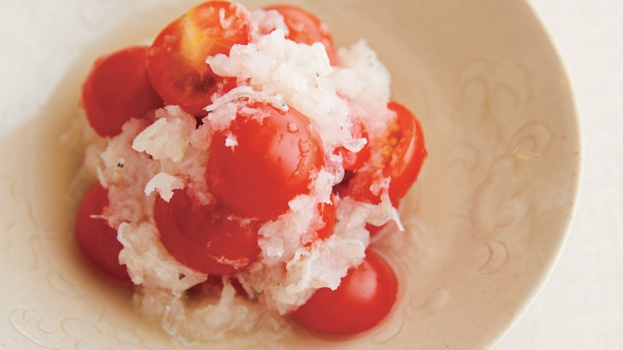 大根おろしをボウルに入れ、【A】を加えて混ぜ、ミニトマトとちりめんじゃこを加えてあえる。
