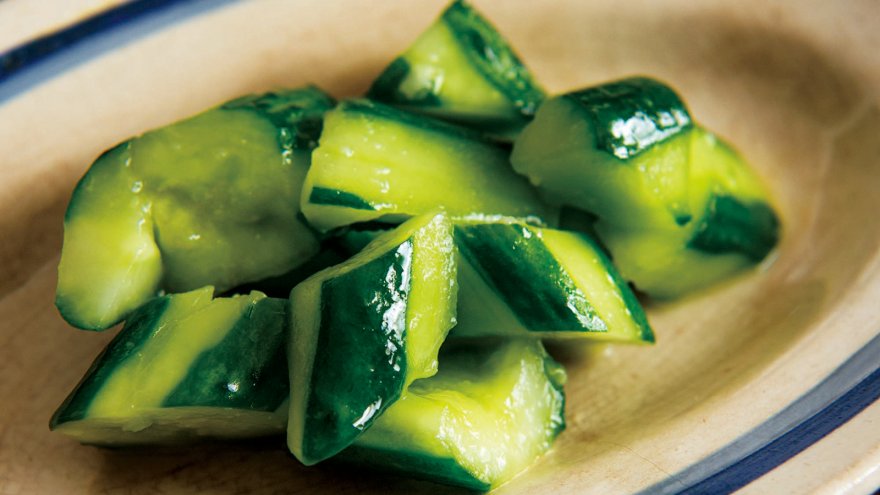 きゅうりは皮をしまむきにし、一口大に切る。ポリ袋に入れ、麺棒で粗めにたたく。