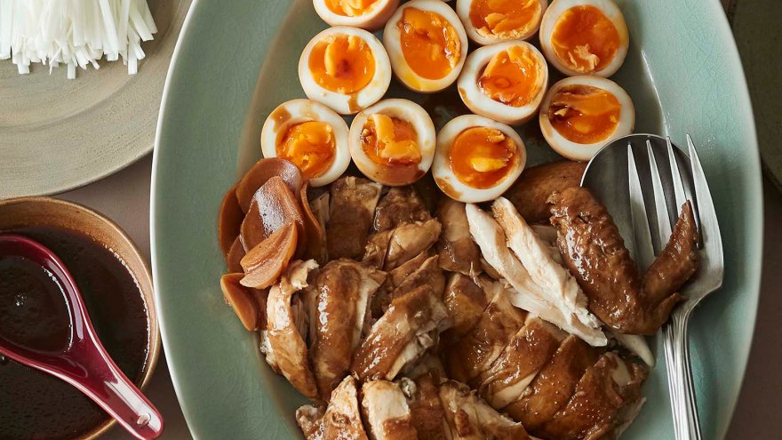 鶏の粗熱を取っている間に煮汁は中火で10分間煮詰め、ゆで卵を加えて火を止める。そのまま30分間以上おき、ゆで卵を取り出す。残った煮汁の適量をさらに半量くらいまで煮詰めてたれをつくる。