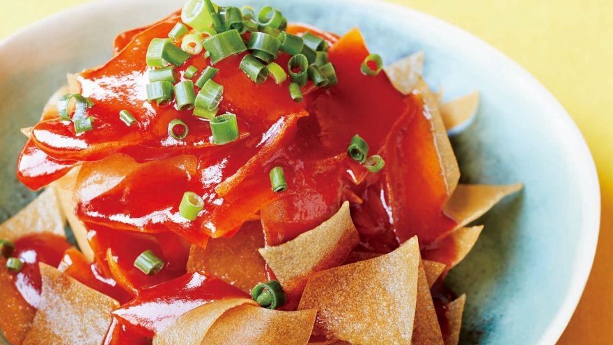 1~2枚だけ残ってしまった春巻の皮。一口大に切ってカリッと揚げて、乾燥剤と一緒にジッパー付き保存袋に入れておくと重宝します。おかゆやサラダのトッピングにしたり、刻んだザーサイと合わせておつまみにしたり。えびチリなどのおかずにあしらうと、ごちそう感がグーンとアップ!