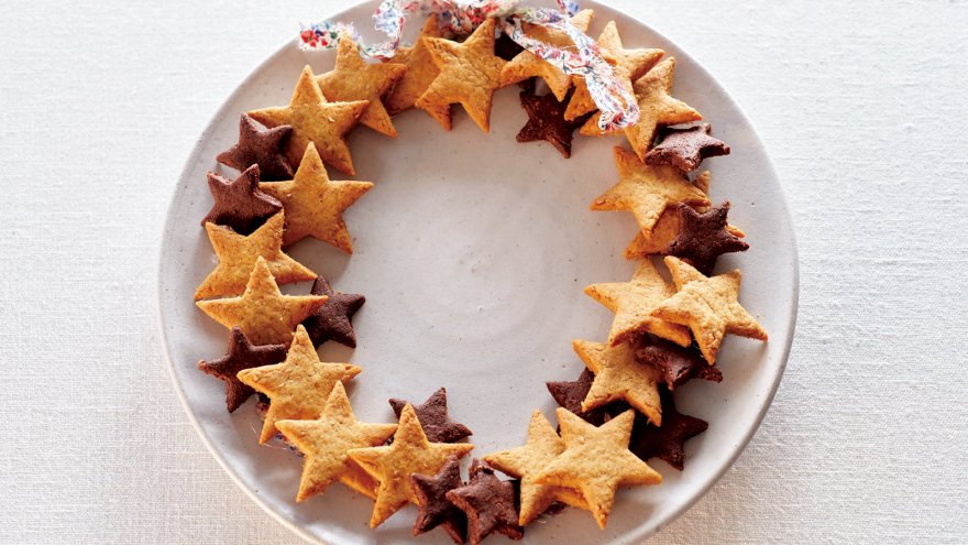 広げたオーブン用の紙にのせ、麺棒で5mm厚さにのばし、型で抜く。天板に並べ、170℃のオーブンで15~18分間、焼き色がつくまで焼く。天板ごと網の上に取り出し、冷ます。