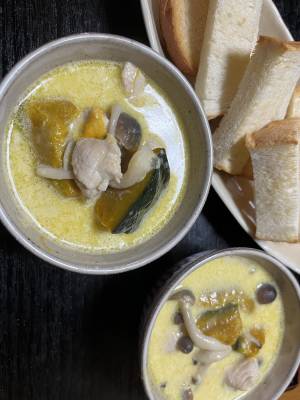 牛乳を加え、軽く混ぜて火を止める。パンは一口大に切り、オーブントースターでこんがりと焼く。スープを器に盛り、パンをのせる。