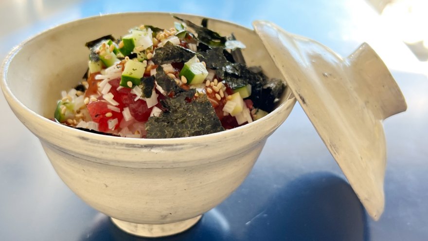 まぐろは栗原さんの大好物。さっぱりとした赤身に、コチュジャンを入れた韓国風のたれ、ねぎ、ごま、のりを加えました。味はおいしく、見た目は韓国料理みたいに。