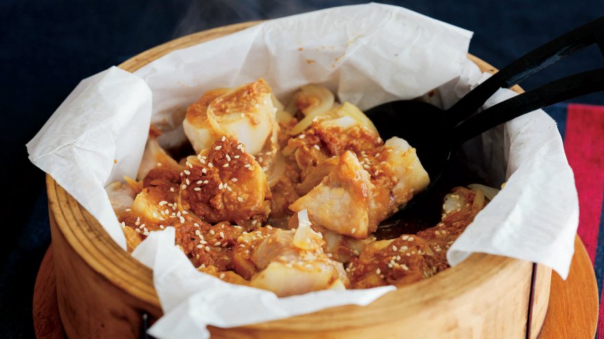 濃厚なみそだれに、柚子(ゆず)の香りと彩りがアクセント。蒸し料理なら里芋はホックリ、豚肉は脂が落ちてヘルシーに食べられます。