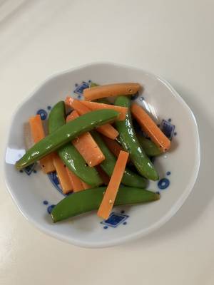 にんじんは3~4cm長さ、7~8mm幅の薄切りにする。絹さやはヘタと筋を除く。