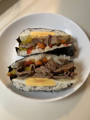 ご飯によく合う甘辛味の焼き肉と、目玉焼きでボリューム満点。パプリカの赤色も食欲をそそります。