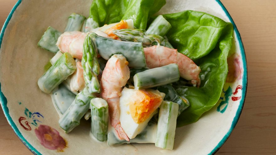 サッとゆでるだけで甘みが引き立つアスパラガスと、スナップえんどう。ピリッとしたわさびマヨがアクセント。