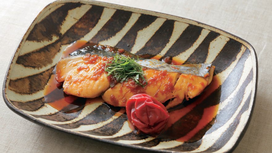 鍋にさわら、梅干し、【A】を入れ、落としぶたをして強火にかける。煮汁が少なくなってきたら落としぶたを外し、煮汁をさわらにかけながら煮る。煮汁が少し残るくらいでさわらと梅干しを器に盛り、青じそをのせる。