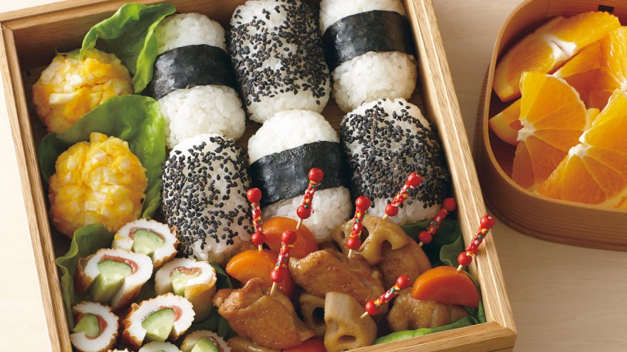 おにぎりを俵形にしたり、ゆで卵をアレンジしたり、煮物を串に刺したり。つまみやすくて、彩りも豊かなアイデアが詰まったお弁当です。