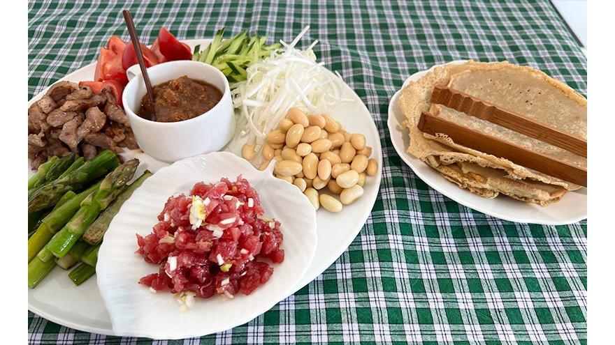 それぞれの材料を器に盛り、そば粉のクレープに好みの具材、みそだれをのせ、巻いていただく。