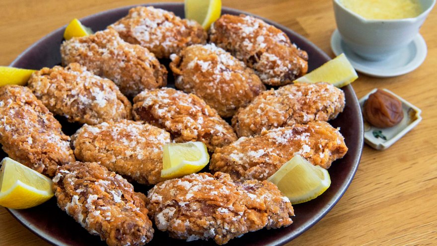 衣の上からかたくり粉をたっぷりとまぶすことで、カリカリに揚がる。