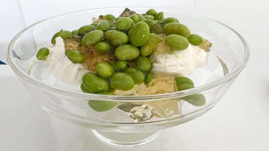器にモッツァレラチーズを盛り、枝豆のジュレをかける。好みですりおろしたわさびを添えてもよい。