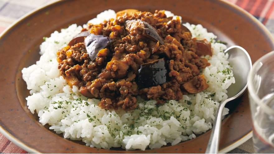なすとひき肉は相性バッチリ。柔らかななすに、ひき肉のうまみとカレー風味がジュワッとしみ込みます。