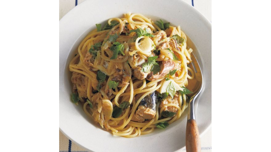 うまみたっぷりのさば缶は、汁ごと使ってパスタのソースに。たまねぎの甘みが、全体をマイルドにまとめてくれます。仕上げに加える青じその爽やかな香りがアクセントに。